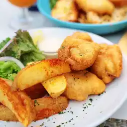 ⭐ Fish and Chips, fried fish served with thick pieces of potatoes.