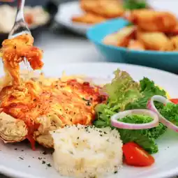 ⭐ Mermidor lobster, stir-fried with spices and mushrooms before baking with cheese. I like this menu.