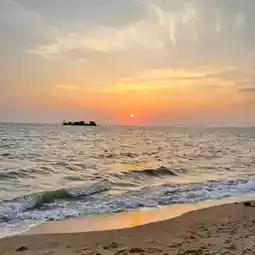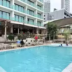 A hotel on Na Jomtien Beach, just a few meters from the sea. It is both an accommodation and a restaurant plus a bar. There is a swimming pool in front of the hotel with a sea view. The atmosphere is quiet. The beach in front of the hotel is soft sand. People like to have picnics and fly kites. It is a hotel with a very beautiful view. You can see the sea as far as the eye can see. It is suitable for dinner and watching the sunset. In the evening, the atmosphere is very romantic. The golden light reflects on the sea. After dark, the hotel's decorative lights bring life to you. You can walk here. It is not lonely at all.
