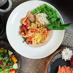 •Pad thai with fresh shrimp: Pad thai with a rich flavor, topped with shredded eggs and large shrimp