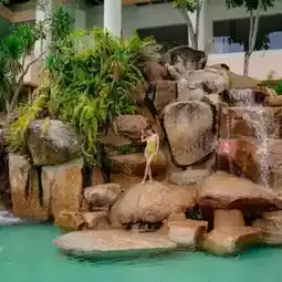 The swimming pool is very large. There is a simulated waterfall. Bring your family to relax.