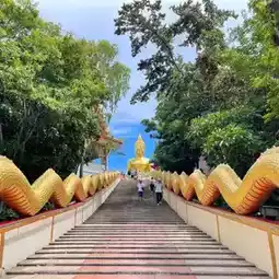This temple is located on Pattaya Hill. From the viewpoint inside the temple, you can see the view of Pattaya. There are many buses of foreign tourists every day. There is a large Buddha statue on top of the temple. You have to walk up the stairs. There are places to make merit for the Buddha of your birth day, make merit to resolve bad luck, make offerings to monks. There is also a place to rent sacred objects to take home to worship. Along the way up, there are many shops and souvenir shops.