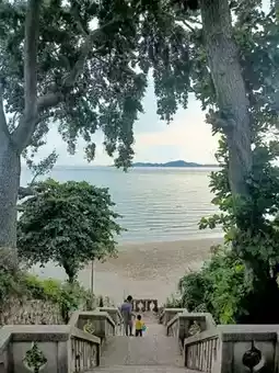 Shallow beach, fine sand, clear water, in front of Asia Hotel, there is a beautiful seawall and many small oysters piled up together.