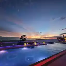 A large outdoor rooftop pool is beautifully contrasted with the blue of the sea. Enjoy a relaxing swim in the Jacuzzi. Or relax on the ๐บ๐๐ ๐ฉ๐๐
