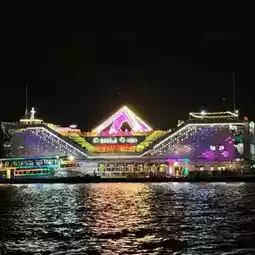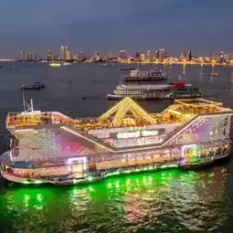 A large boat with a speedboat every 15 minutes. There is a 90-minute cruise service. The boat fee is 250 baht per person. Squid fishing is 250 baht per person. The boat provides fishing rods. The 2nd floor is a large restaurant with music and shows. If you want to take a picture with the performers, you have to pay an additional 100 baht per person. The rooftop is a buffet area. The food is 990 baht per person. There is live music. There are many tour groups.