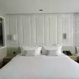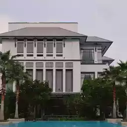The hotel's color tone is white and gray, contrasting with the surrounding green trees