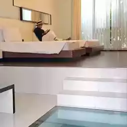 For this trip, we chose a pool access room on the ground floor. You can go swimming right away. The room is spacious, well-proportioned, with a separate sitting area from the bedroom. There is a clear glass that allows you to see the pool below from the floor of the room.