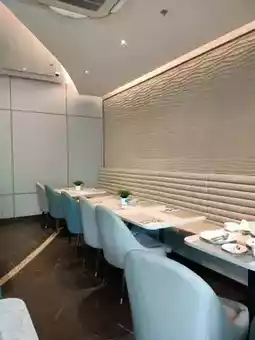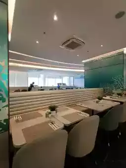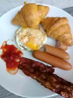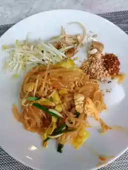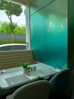 The interior of the restaurant is decorated in white tones, with white walls and some parts decorated with coral green. There are many types of food to choose from, such as bread, coffee, tea, soy milk, cereal, pancakes, fried eggs, bacon, sausage, Thai food, chicken rice, and Pad Thai.