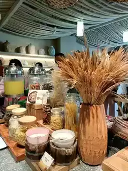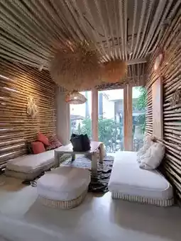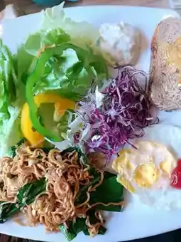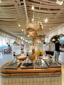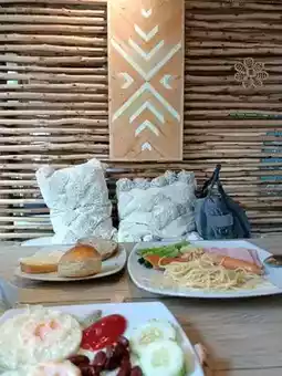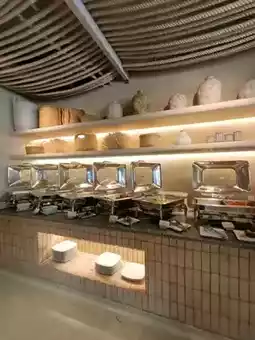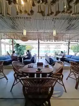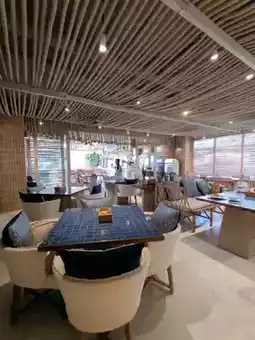 The restaurant in the morning is a breakfast buffet, during the day it is a cafe, and in the evening it is decorated in a Bohemian style, with a unique island-like atmosphere, emphasizing the sea. The ceiling is decorated with large ropes and wooden woven baskets. The front is open, and there is a swimming pool. The food includes bread, drinks, Thai food, and fruits.