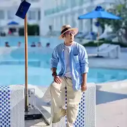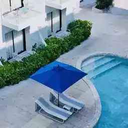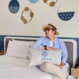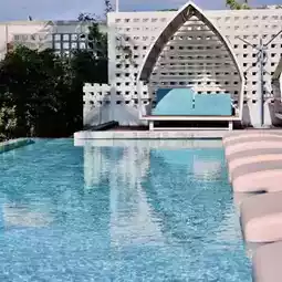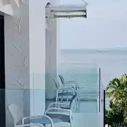 A super cool hotel in Pattaya - Na Kluea, decorated in a Santorini style, Kram Pattaya - Kram Pattaya is a beachfront accommodation. The hotel is decorated in bright blue and white tones.