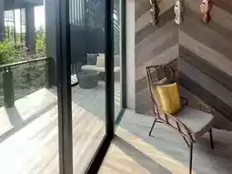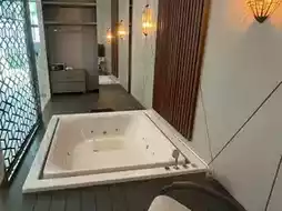 The lobby is opposite the parking lot. There is a golf cart service to take you to your room. We booked a Topaz Jacuzzi room. The interior is decorated in the amber theme, as the room name suggests. There is a very large soft bed. There is a sofa to watch TV. There is a wide balcony to sit and watch birds and trees outside. There is a large private Jacuzzi that can accommodate 3-4 people at the same time. The bathroom is also spacious. There is a refrigerator and a mini bar (free drinks and snacks). There are also welcome drinks and macarons waiting in the room.