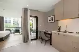 Altera Hotel and Residence is located in the center of Pattaya, just a 5-minute walk from the beautiful beach. The hotel features modern decor and serviced apartments with fully equipped kitchens, microwaves, washing machines, and more. The picturesque balconies and elegant outdoor swimming pool provide guests with a comfortable and relaxing environment. The hotel's stylish and minimalist decor makes it feel like a peaceful haven.