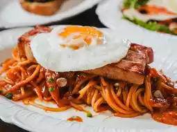 🥓 Pasta Kimchi Kimchi pasta topped with Korean-style grilled pork, this dish is the ultimate fusion.