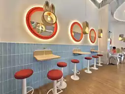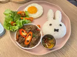 This is a Miffy rabbit cartoon cafe located in Pattaya City, Chonburi Province. In front of the shop, there is a Miffy cartoon character standing to welcome customers. When you enter, it's like you've entered Miffy's town. Every table has a Miffy doll sitting. There is a large ball pit and a slide in the middle of the shop for children to play. There are many cute photo corners, very suitable for Miffy fans.