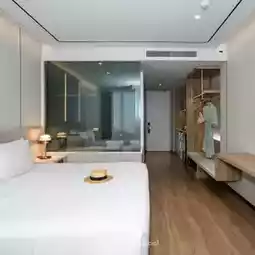This room has a bathtub inside with see-through glass. 😁 But if you want privacy, you can press the switch to turn it blackout. Hehe. The bed is very soft and comfortable. I also like that there is a kitchen area. Washing machine ready Suitable for those who want to come and relax for a long stay as well.