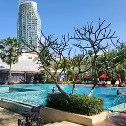 A seaside resort in Na Jomtien Pattaya with 3 swimming pools, the 2 pools in the middle are next to each other but separated by a path that looks like a parted sea. Looking from above, it is very beautiful. It is the most inviting place to swim. 🥰 There is also a slide to play.