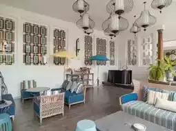 • The rooms are decorated in a luxurious Moroccan style in a sea blue tone. There are large glass windows with a view of the sea. The sunset is beautiful.