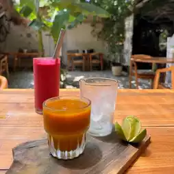 The cafe is beautiful and the service is good, prices and quality are good. We started with shots of pressed ginger & soda and a vitality & soda! Loved these drinks! We shared the focaccia with dukkah, the hummus, tomato salad with yogurt & cardamom dressing.