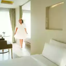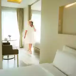 Today, Nicky came to stay, recharge near home. 🏠 This hotel is located near Wong Amat Beach. Just a few steps from the pool to the beach. The new zone must be a hit. ❤️ For those who love taking pictures, the accommodation is beautiful and decorated in white tones. 📸 There are many photo spots. Today, Nicky came to stay in a 2 Bed Room Pool Access room that can accommodate four people. The interior is divided into 2 bedrooms and 2 bathrooms. You can come as a family. 🎊 Or a party party 🎉 with a gang of friends.