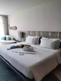 Veranda pattaya is located on Na Jomtien Beach. The decoration here is very beautiful. Welcome with a colorful welcome drink. The room we chose was spacious and comfortable. There was a bathtub to soak and watch the sea view. The swimming pool here is very beautiful. It is in a contrasting blue and white tone. The room requested an anniversary. The hotel arranged it in a cute way. Dinner was at I Sky, the hotel's restaurant. The view is very beautiful. Breakfast here is also excellent. There is nothing to complain about. #Get a discount without relying on luck