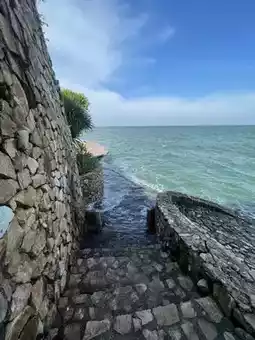 There is a pedestrian path along the beach, and the territories of expensive high-rise hotels come out onto it. At low tide, the beach is wide, and the water is shallow. At high tide, it is a narrow strip of sand and immediately a deep, waist-deep sea, which is often rough.