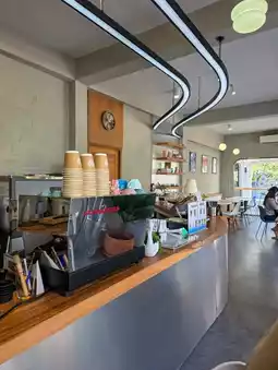 The interior is decorated in a minimalist style with a bare concrete tone. Natural light comes through the large glass windows, making the atmosphere bright and airy.