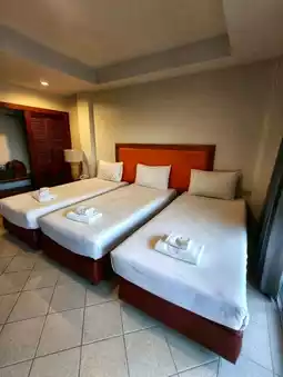 We booked a room for 3 people. Inside the room are 3 single beds for 3 people. There is a small kitchen, sink, microwave, refrigerator, and cups and plates. New and clean, very convenient.