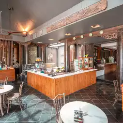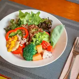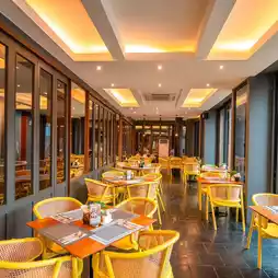 It is located in front of the hotel. It is a restaurant and part of the hotel.