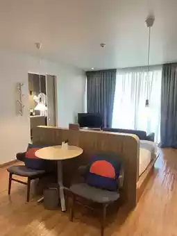 - The room is spacious, has a sofa, a table and chairs to sit and eat.