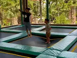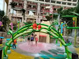 The grand swimming pool and kidzone are packed with toys. This was my first visit here, and I was truly impressed. The hotel is stunning, surrounded by nature, and incredibly spacious. There are so many activities that you don’t even need to go anywhere else. The swimming pool is massive, with a kids' pool about 120cm deep. The water is quite cool and flows continuously through waterfalls, bridges, and tunnels. The hotel provides free inflatable rings for guests to use, and there are multiple levels of fun. The main pool is heated, with shallower areas near the edges and deeper sections as you move inward. At the top, there’s a cliff diving spot, and the slides here are spectacular—tall and super fun! The hotel is huge and located by the sea, which the kids absolutely love. The private beach is great too. The kids' club is part of the Lost World area and offers both free and paid activities. Free outdoor activities include trampoline jumping, sand play, and climbing, while the indoor air-conditioned area features coloring, movie watching, building blocks, and arcade games (which require 10-baht coins). Paid activities include zip-lining and rope climbing.