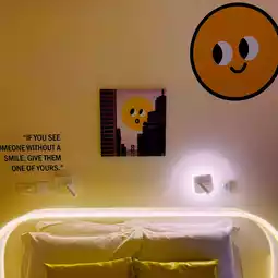Mood Hotel is one of the accommodations with a unique identity and bright atmosphere like no other. From the entrance to the lobby, every corner is full of playfulness and creative design, focusing on bright yellow tones and cute emoji patterns, making you feel like you have entered a world of happiness and positive energy.