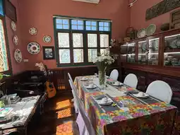 A charming heritage house surrounded by lush greenery, offering both indoor and outdoor seating. The space doubles as a living museum, blending the elegance of a former aristocratic residence with the comfort of a family-friendly dining spot.