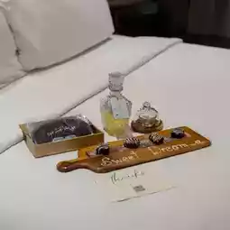 #Room: Our room was the Luxury Ocean View, a room with a private balcony offering panoramic sea views. The room was spacious and spacious, with a comfortable king-size bed. The bathroom was divided into separate "his and hers" areas and a beautiful bathtub. In the evening, a turndown service was offered, with staff providing chamomile tea, ping (sweet pastries), eye masks, and earplugs.