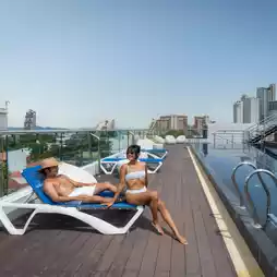 The top floor features an outdoor swimming pool with sea views. Sunbeds are provided around the pool. Next to the pool is a bar serving food and drinks.