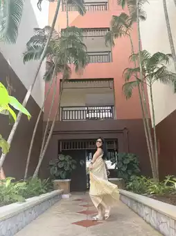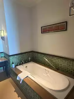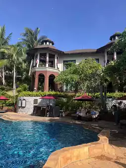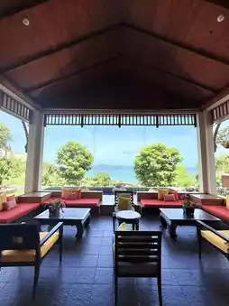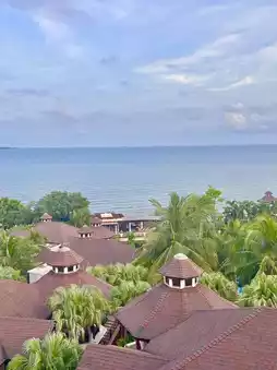 The hotel is situated on a hill, and upon entering the lobby, you'll find an open-air space without air conditioning, yet it feels quite cool. Guests are welcomed with a towel and a drink while checking in. The overall style of the resort is surrounded by palm trees and tropical gardens, creating a strong vacation vibe. After completing the check-in process, staff will escort you to your room via a golf cart. The resort features three swimming pools, a spa, a private beach, and a fitness center.