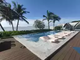 This beachfront hotel has a beautiful swimming pool. I've been here many times because I love it. The large pool is beautifully designed. From your room, you can see the pool view, which is a highlight of the place. Walking to the back is the sea. It's absolutely beautiful, everyone! The view is stunning. However, I recommend going in the evening because the water is beautiful. Low tide in the morning makes for less beautiful photos. 🏝️