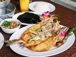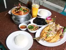 🍛Today, we tried the Tom Yum River Prawn soup, which was incredibly flavorful with large, juicy prawns. We also tried the squid stir-fried in black sauce, which was incredibly delicious. We also tried the crispy fried sea bass with fish sauce, which was deboned for you, served with a delicious mango salad.