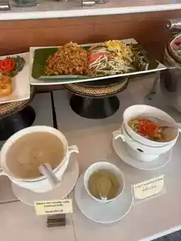 The breakfast was worth the anticipation. It included standard items like an egg station, salad, yogurt cups, fruits, cakes, and bread. Additionally, there were heavier dishes such as BBQ pork ribs, tamarind sauce fried river prawns, seafood fried rice, stir-fried beef, coconut milk noodles, stir-fried beef with oyster sauce, chicken massaman curry, calamari, iced shrimp with seafood sauce, soy milk with Chinese donuts, and mango sticky rice.