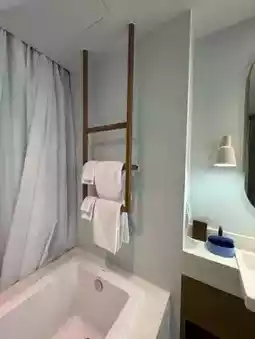 Upon driving in, I found parking conveniently in front of the check-in building. The staff promptly assisted with my luggage, and I proceeded to check in on the second floor, where a Welcome Drink was served. The check-in process was quick, and the staff then escorted me to the accommodation building. This time, I stayed on the third floor in room 331. The hotel features abundant greenery, creating a serene atmosphere, along with amenities like a spa, swimming pool, and beachfront access. I booked a Deluxe room via Agoda, which offers 45 square meters of space. The air conditioning was cool, the water pressure was strong, and the room included a bathtub with separate wet and dry zones. However, the bathroom design might feel a bit revealing as it is separated from the bedroom by a curtain. The minibar was complimentary, featuring welcome fruits, four bottles of water, and fruit jelly.