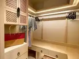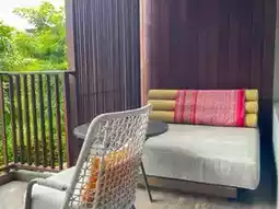 The balcony is spacious, with a table and chairs, a sofa, triangular pillows, and a clothes rack.
