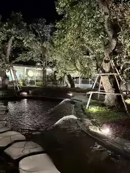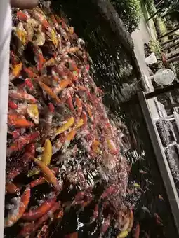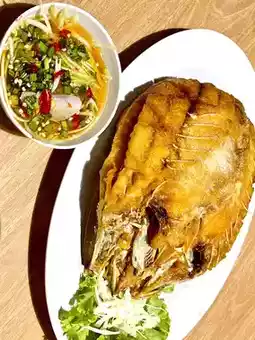 The restaurant is very large and has a great atmosphere. There are many seating areas to choose from, including booths, air-conditioned rooms, and even a karaoke room. The garden is beautifully landscaped, with dinosaurs and a large number of koi fish. Fish food is available for purchase, 25 baht per bottle. There are also turkeys, feathered chickens, and giant mice to watch. Children should love it. It's also pet-friendly. The food is inexpensive compared to the portions. The portions are large and generous. The staff are polite and friendly.