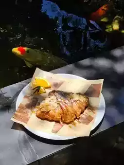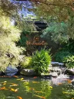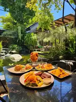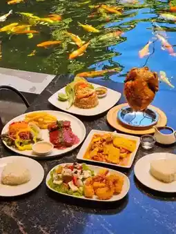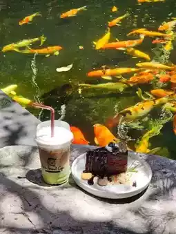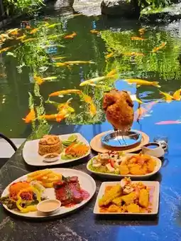 We're sharing the location of this Pattaya cafe and restaurant with a large koi pond in the center of the restaurant. The atmosphere is lush and green. There's both a semi-outdoor seating area with a view of the koi and a small waterfall, and an indoor seating area with cool air conditioning. They also have private banquet rooms. The decor is stunning, perfect for taking photos from any angle. The food is also delicious.