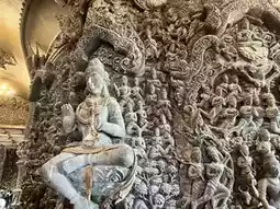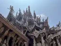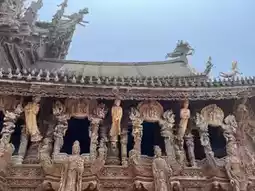 Often translated as "The Temple of Truth," but it is not a temple. Its roof features a four-faced Brahma statue symbolizing respect for parents, teachers, and rulers. Surrounding it are intricate wooden carvings blending Siamese, Indian, Khmer, and Chinese art, showcasing various deities and figures from Hinduism and Buddhism in East Asia.