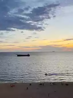 Witness nature’s daily masterpiece at Jomtien Beach! As evening falls, the horizon ignites in shades of gold, pink, and violet, reflecting off the calm waters of the Gulf of Thailand. Locals and travelers gather along the shore—strolling, swimming, or simply sitting in silence as the sun melts into the sea.