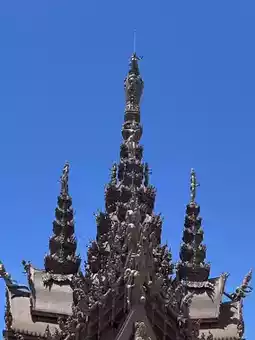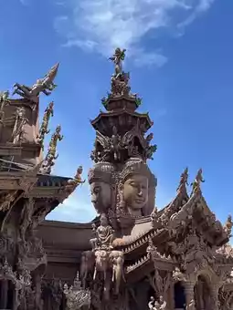 Standing tall against the bright Pattaya sky, The Sanctuary of Truth is more than a temple—it’s a symphony in wood. Every inch of its towering exterior tells a story: gods, goddesses, mythical creatures, and cosmic patterns carved with breathtaking precision.