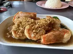 A seafood restaurant with friendly prices. The prices are truly worth it considering the portions and delicious food. The seafood is incredibly fresh. We ordered the fried garlic shrimp. The shrimp were quite large, the squid with curry powder, and the steamed sea bass with lime (with separate chilies).