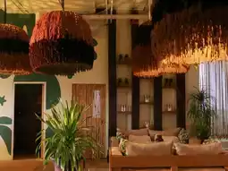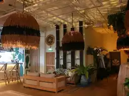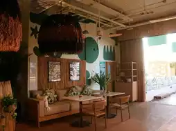 💺 The cool seating area is decorated with wood tones and greenery, creating a modern, natural feel.