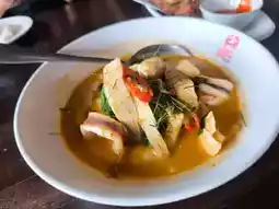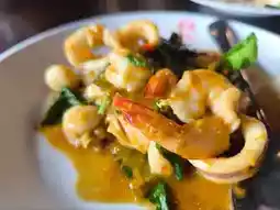 - Seafood curry, a rich and flavorful coconut milk curry served with young coconut shoots.