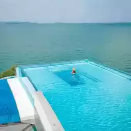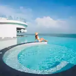 The highlight is the Sky Aquarium Pool & Bar, offering panoramic views. There's a bar where you can relax with a drink, and a children's play area. The evening light is especially beautiful, as it's the longest swimming pool in Thailand. There's also a jacuzzi below. There's also a spa and a kids' club. There's also a Japanese, Thai, and international restaurant, and a beachfront restaurant for strolling and taking photos. It's all in one place, so you hardly need to go anywhere else.