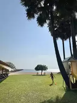 A minimalist cafe in Pattaya with a white and black tone, decorated with white sand and large glass windows offering a view of the sea and sunlight. Relaxing vibes with signature menu items like pies and excellent service. ✨